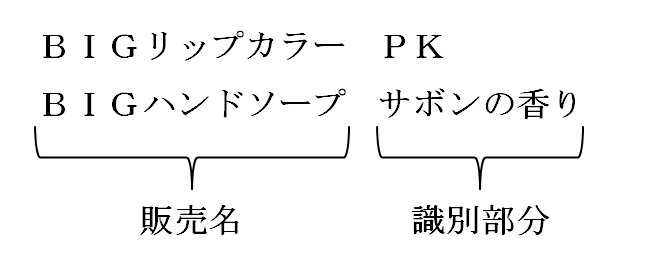 また、色や香りの違いを示す部分は「識別部分」と呼ばれ、パッケージ等には販売名と同一行でまとめて表示する必要があります。