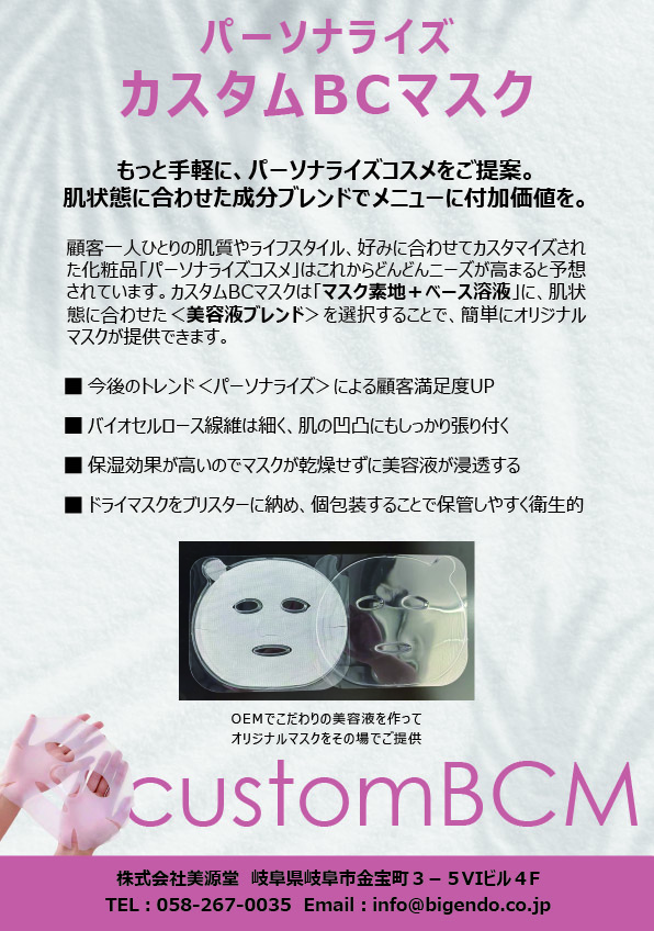 カスタムバイオセルロースマスク 2026年1月20日2026年1月20日 2026年1月のCOSME Week化粧品開発展にてご紹介いたしました、パーソナライズできるカスタムバイオセルロースマスク! 展示会中も多くの方にご興味を持っていただけました。ドライバイオセルロースマスクと専用容器をセットに、ベース溶液と選べる美容液を混合することで、オリジナルのフェイスマスクが簡単に作れます。 この商品についてサンプルのご希望や詳しく知りたい方はこちらへ お問い合わせはこちら